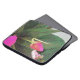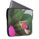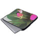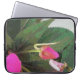 The artwork on this 15” Laptop Sleeve is an original photograph by MaeFlowers of a New Guinea impatiens plant, in bloom with hot pink flowers. The photo is a closeup showing parts of the bright pink flower petals, a flower bud in a more pale pink color, and the remains of an earlier bloom. The dark green leaves of the impatiens are long and pointed, with jagged edges against a warm light gray background. The design has a tapestry texture.
