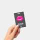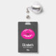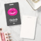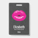 Personalized name badge with an illustration featuring hot pink lips. Bold and vibrant image. Set on a black mottled background.
