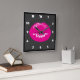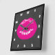 A clock with an illustration featuring hot pink lips. Bold and vibrant image. Set on a black mottled background.