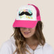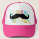 Bright neon hot pink trucker hat with mustache graphic, and a background of bright rainbow paint splatters, a bright girly teen or womens array of color. Fun and fresh and vibrant.