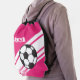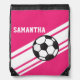 This design features a soccer ball and white stripes against a hot pink background. Personalize this drawstring backpack with a name. This bag is great for holding a soccer ball, shoes and other sports accessories. This cinch sack also makes a great gift for soccer players.