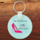 A keychainwith an image of a hot pink stiletto shoe. Set on a mint green watercolor background. Chic and glamorous. Personalize with your name, website and title, or other text you wish to use.