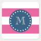 Hot Pink Stripes Pattern, Navy Blue Monogram Square Sticker