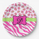 Have a stylish and trendy party with these paper plates personalized with your monogram initial. Colorful zebra stripes and leopard or cheetah skins for graphic design is one of the hottest art and design trends, and will make an attractive party theme. This fun and stylish hot pink fuchsia and zebra and leopard print pattern is available in several color combinations. A fuchsia hot pink emblem on a lime green strip creates a personalization area with your monogram initial, name or other words. This is fully customizable.
