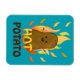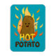 Fun cartoon brown potato with a big happy smile, dots for eyes and sticks for arms. He is surrounded by yellow and orange hot burning flames. Below him in orange and yellow text is the word HOT and below that in brown text is the word POTATO. Fun quirky design for a laugh.