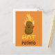 Fun cartoon brown potato with a big happy smile, dots for eyes and sticks for arms. He is surrounded by yellow and orange hot burning flames. Below him in orange and yellow text is the word HOT and below that in brown text is the word POTATO. Fun quirky design for a laugh.