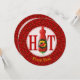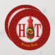 HOT letters with the O made with a chily pepper sauce bottle over red seamless background.