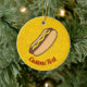 Cartoon illustration of hotdog. Junk food outline icons yellow pattern background. Custom text on both sides.