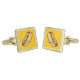 Cartoon illustration of hotdog. Junk food outline icons yellow pattern background. Custom text on each cuff-link.