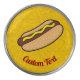 Hot dog icon. Junk food outline icons yellow pattern background. Custom text.