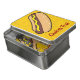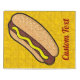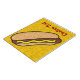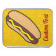 Hot dog icon. Junk food outline icons yellow pattern background. Custom text.