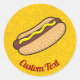 Cartoon illustration of hotdog. Yellow seamless junk food pattern background. Custom text.