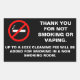 Hotel room no smoking sign. Thank you for not smoking. Up to a $$$ fee will be added for smoking in a non smoking room. Custom fine.