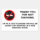 Hotel room no smoking sign. Thank you for not smoking. Up to a $$$ fee will be added for smoking in a non smoking room. Custom fine.
