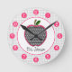 A clock for teachers featuring an illustration of a houndstooth apple Personalize with your name under apple. Clock features white numbers on pink dots.