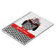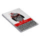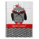 A spiral notebook featuring an illustration of a gray and black owl with a houndstooth belly and red feet. Owl is wearing a red and black fascinator hat and red cat eye sunglasses. Personalize with your name.