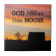 Ceramic tile featuring the photo image of a colorful sunset along with a house blessing that reads, "God bless this house" in black lettering. Select your tile size. Makes a thoughtful gift for family and friends.