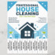 A professional house cleaning services flyer design with tear-off tabs featuring bright blues and whites. The center showcases illustrations of cleaning supplies like spray bottles, vacuum, and bucket, arranged around a stylized house silhouette. It includes contact information and list of services. It is fully customizable and can be suitable for activities such as windows or house cleaning, janitorial, maid, housework, etc.