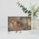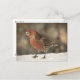 This postcard features a male house finch standing in the snow. He has lovely has red plumage on his head and breast. Snow clings to his beak. The luminous background is in shades of gold, gray, orange and white.