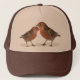 This hat features two male house finches standing in the snow. They have lovely red plumage on head and breast. Snow clings to the beaks.