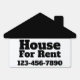 The text shown says "House for Rent". At the bottom, there's a place for your phone number. The display text is white. This house for rent sign is shaped like a house. The roof is black. The rest of the house is white. You can change (edit) the text and phone number.
