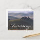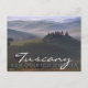 Postcard of a farmhouse in the morning fog at the break of dawn in Tuscany between the rolling hills of the Val d’Orcia valley between Pienza and San Quirico d’Orcia in Italy with the text: 'Tuscany, San Quirico d'Orcia'.