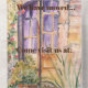 A vintage watercolor of a rustic doorway half in glass window and half wood, a brick wall in shades of ochre a step before the door with two lovely pots with red flowers beside the step. From my arquitecture collection of paintings.