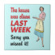 Have a little fun with this tile that shows a 1950s-era housewife holding a plate with the text, "The house was clean last week, sorry you missed it" to the left of her. A fun vintage look if your house isn't always the tidiest. The background color can be changed by clicking the "Customize It" button and selecting "edit">"Background color" to choose a new color. Available with matching products.