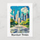 A vibrant watercolor painting of the Houston skyline, featuring iconic skyscrapers like the JPMorgan Chase Tower and the Wells Fargo Plaza. The cityscape is framed by a wide avenue lined with lush green trees, creating a sense of urban grandeur and natural beauty. The sky is a clear blue with fluffy white clouds, adding to the overall sense of optimism and energy.