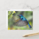 Animal card showing a beautiful blue hummingbird hovering nectar from flowers. Hummingbirds are New World birds that constitute the family Trochilidae. They are among the smallest of birds. They are known as hummingbirds because of the humming sound created by their beating wings which flap at high frequencies audible to humans. They hover in mid-air at rapid wing flapping rates, typically around 50 times per second, but possibly as high as 200 times per second. Hummingbirds have the highest metabolism of any homeothermic animal. To conserve energy when food is scarce, they have the ability to go into a hibernation-like state.