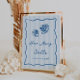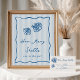 This beautiful coastal bridal shower guessing game sign features Mediterranean blue handwritten style cursive lettering accented with a wavy scribble ribbon border, with two hand drawn seashell illustrations and the words "how many shells are in the jar?" Ready to frame; choose professional printing and shipping or the instant download option to print locally or at home. Pair with our matching shell guessing game cards from our Love & Lobster collection.