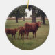 Lovable Red Angus cow and her calves look curiously while taking a break from their contented grazing in a wooded pasture. Ornament reverses to country green stripes.