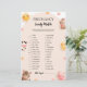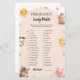 This adorable baby shower game card features a charming farm animal theme with cute illustrations of a cow, bunny, chick, horse, and pig, surrounded by cheerful flowers and a smiling sun. The soft pastel colors and whimsical design create a warm and inviting atmosphere. Visit our shop to view our entire Brown Cute Farm Animal collection.