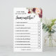 Guests answer questions about the bride, after fill in all their answer, bride answers all questions and guest will check on right boxes which one they guess correctly and write the total of correct answers at the bottom line. The person with the most correct answers wins.