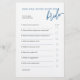 This elegant bridal shower game is a fun way to celebrate the bride-to-be! Featuring classic blue script and a soft minimalist layout, guests will enjoy answering 15 personal trivia questions to see who knows the bride best. 💍 Double-sided,