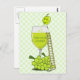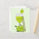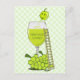 A green grape showing how wine is made by peeing in a wine glass. Funny and silly illustration. Light green / lime plaid background. Wine Glass with a ladder so the grape can climb.