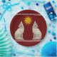 A colorful graphic of howling coyotes in the colors and style of traditional southwestern art.