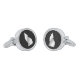 These pretty cuff links for him feature a silver silhouette howling wolf. The image is placed on a dramatic black background.