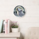 This captivating image features a majestic white wolf howling beneath a luminous full moon. The wolf's fur is intricately detailed, showcasing its wild and untamed beauty. Surrounding the wolf are snow-covered evergreen trees, adding a touch of winter magic to the scene. The night sky is dotted with stars, enhancing the mystical and serene atmosphere. This artwork beautifully captures the essence of nature and the wild, making it a perfect addition to any clock design.