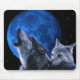 Two wolves howling at a the night sky, with a big blue moon hanging low.