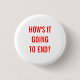 I adopted the phrase, "How's It Going To End?" immediately as my mascot and moniker everywhere - and was thrilled to learn that Zazzle had a facsimile button like the one seen in the film - available for purchase. I like the smaller button because it's subtle and thought provoking without being a preachy loudspeaker. Thanks, Zazzle! The quality of printing and production of this button is wonderful. Although it's not quite as small nor as convex as the button you see in the film - (the button offered by Zazzle is a little less rounded in the center nor does it slope up like an M&M) - it's still a good "stand in" which inspires discussion.
