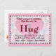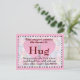 This postcard has a double purpose. It is both a fun greeting card and a coupon the recipiant can redeem at a later date. Love and hugs are the theme, with a pink heart and light candy hearts patterned background. Great for Valentine's Day or any other special occasion.