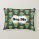 An accent pillow with the text: Hug Me, written inside a fancy frame. Designed with a repeating pattern. A cute illustration of a plump round cactus, with big kawaii eyes, smiling and wearing a red sombrero. Standing inside a flower pot. The background is a black chalkboard image.