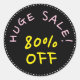 This round sticker design features the messages "HUGE SALE!" and "80% OFF". It could be used in a retail shop to mark merchandise that is on sale. The discount amount can be personalized. The text is colored light pink and yellow, and the background is black.