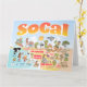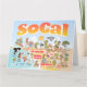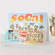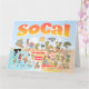 Bright and colorful scene offers a spectacular view of Southern California - wacky characters frolic on the beach and desert of SoCal showcasing Los Angeles, San Diego, Orange County, Santa Barbara, Riverside, Palm Springs, Anza Borrego and Joshua Tree parks as well as the border cities of Tijuana, Tecate and Mexicali. This charming scene has it all – a surfer hangs ten while a killer whale leaps out of the water, zoo animals greet the tourists, a muscular beach couple both flex to impress as a T-Rex roars a challenge and a tank moves into position and much more…