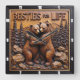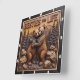 This highly dimensional square wall clock features an illustration of two brown bears hugging in a dense forest setting. The entire design is rendered in rich brown and orange tones, strongly suggesting a deep carved relief or Engraved Wood Look. The bears have highly textured fur and are surrounded by stylized pine trees, large boulders, and mountain peaks in the background. The carving style creates a strong three-dimensional effect, emphasizing the depth of the forest scene. The large, three-dimensional embossed text "BESTIES FOR LIFE" is carved across the top. The clock face features a simple clock face border with large, white, numbered tick marks (1 to 12) integrated into the outer frame. The artwork is surrounded by a thick, dark brown decorative border that resembles a black wood frame.