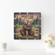 This appealing square wall clock features a highly dimensional illustration of two golden-brown bears hugging beside a stream or river. The artwork is rendered in warm brown, green, and pale orange tones, strongly suggesting a deep carved relief or Engraved Wood Look. The bears have highly textured fur and are positioned on a bank of grass and rocks. The background includes dense, stylized pine trees and layered mountains, indicating a woodland valley setting. The carving style gives the entire image a strong three-dimensional, sculpted quality. The large, three-dimensional embossed text "BESTIES for LIFE" is carved across the top. The clock face features a simple clock face border with large, white, numbered tick marks (1 to 12) integrated into the outer frame. The artwork is surrounded by a thick, dark brown decorative border that resembles a black wood frame.