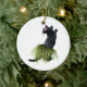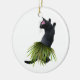 A black cat wearing a green grass hula skirt and with a pink flower behind her ear. This cute dancing cat is makes a perfect Hawaiian ornament. Customize by adding your own words.
