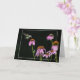 A sweet little hummingbird joins a bee at some purple coneflower blossoms. The shady background makes the image pop.