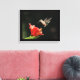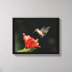 A hovering hummingbird reaches for the nectar of a vibrant red hibiscus flower.